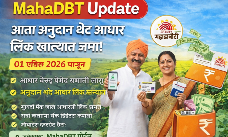 महाराष्ट्रातील शेतकऱ्यांसाठी एक मोठा बदल जाहीर झाला आहे. MahaDBT (महाडीबीटी) पोर्टलवरील योजनांचे अनुदान आता थेट आधार संलग्न बँक खात्यात जमा होणार आहे. या नवीन प्रणालीमुळे शेतकऱ्यांना अनुदान मिळणे अधिक सोपे, पारदर्शक आणि जलद होणार आहे.…